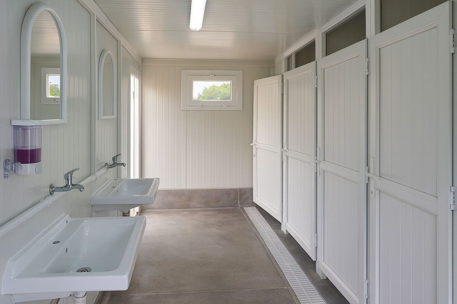 Fiecare container sanitar poate fi echipat cu cabine de duș în număr variabil, chiuvete, ferestre termopan, protecție împotriva umezelii, uși individuale și instalații pentru apă caldă și rece. La cerere, adăugăm accesorii precum perdele de duș, oglinzi, suporturi pentru prosoape, dulapuri, lavoare și pisoare — tot ce este necesar pentru un grup sanitar complet funcțional.